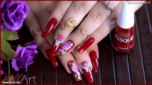 Então hoje eu elaborei esse modelo com o vermelho Carmim da Risqué, que é um tom de vermelho meio fechado, e decorei com uma flor simples em one stroke.